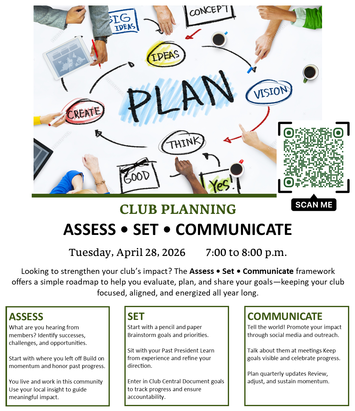 - April 28: Club planning, goals, assessing, communicating