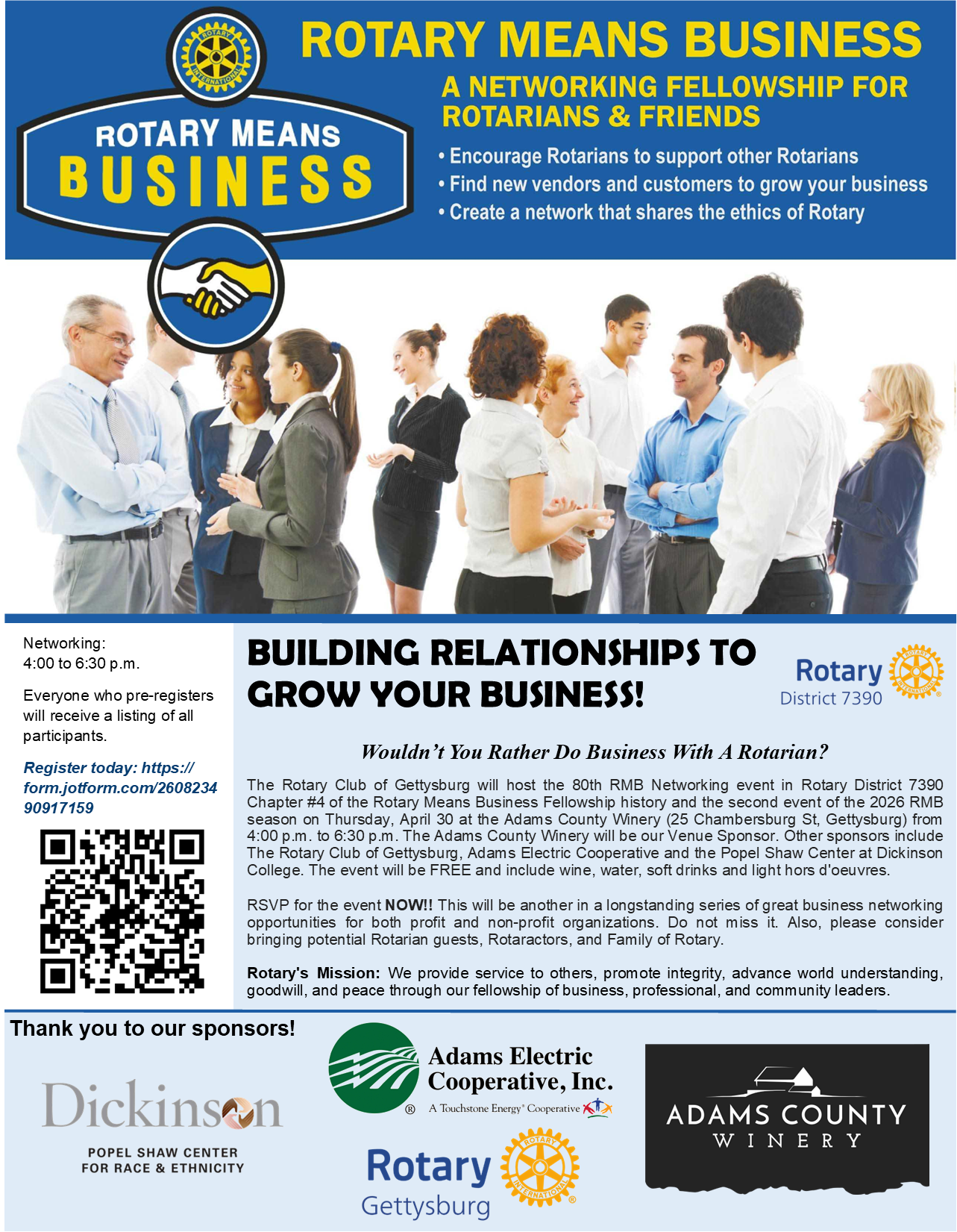 The Rotary Club of Gettysburg will host the 80th RMB Networking event in Rotary District 7390 Chapter #4 of the Rotary Means Business Fellowship history and the second event of the 2026 RMB season on Thursday, April 30 at the Adams County Winery (25 Chambersburg St, Gettysburg) from 4:00 p.m. to 6:30 p.m. The Adams County Winery will be our Venue Sponsor. Other sponsors include The Rotary Club of Gettysburg, Adams Electric Cooperative and the Popel Shaw Center at Dickinson College. The event will be FREE and include wine, water, soft drinks and light hors d'oeuvres.