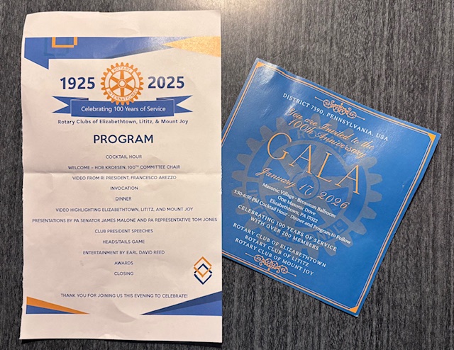 These clubs, The Rotary Club of Elizabethtown, The Rotary Club of Lititz, and The Rotary Club of Mt. Joy has done it for 100 years – 100 years of impact, of friendship, of service. The crowd joined in raising a glass "To those who started it, those who continued it, those who serve today – and to those who will carry it on."