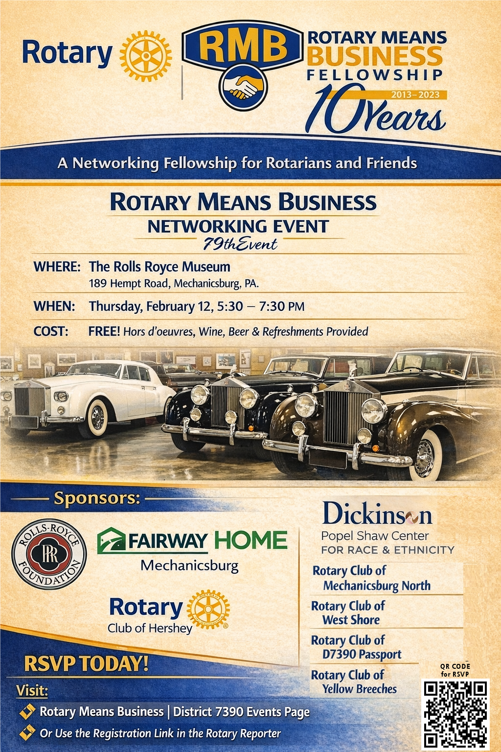 The Rotary Club of Mechanicsburg North in partnership with the Rotary Clubs of D7390 Passport, West Shore and Yellow Breeches will host the 79th RMB networking event in Rotary District 7390 history and the first event of the 2026 RMB season on Thursday, February 12 at the Rolls Royce Museum (189 Hempt Road, Mechanicsburg) from 5:30 to 7:30 p.m.